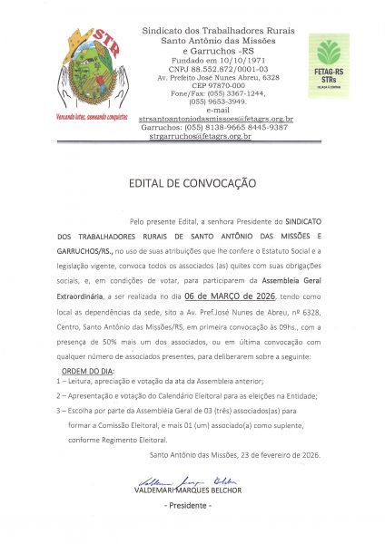 A reunião será realizada no dia 06 de março de 2026, na sede da entidade, localizada na Avenida Prefeito José Nunes de Abreu, nº 6328, Centro, em Santo Antônio das Missões. A primeira convocação está marcada para as 9h, com a presença de 50% mais um dos associados aptos a votar. Em segunda e última convocação, a assembleia ocorrerá com qualquer número de presentes.