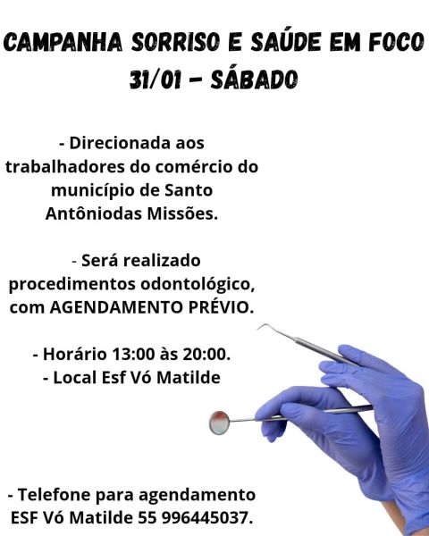 A ação acontecerá no sábado, dia 31 de janeiro, no ESF 2 – Vó Matilde, localizado no bairro DAER, com atendimentos das 13h às 20h. Serão realizados procedimentos odontológicos, mediante agendamento prévio.