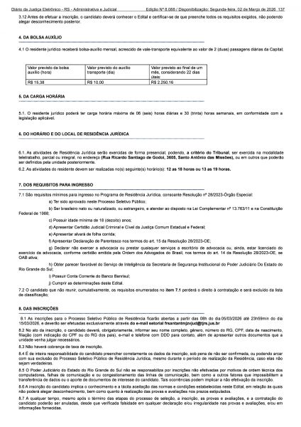 As atividades serão exercidas de forma presencial na Rua Ricardo Santiago de Godoi, 3605, em Santo Antônio das Missões, com possibilidade de teletrabalho a critério do Tribunal. O residente poderá atuar nos turnos das 12h às 18h ou das 13h às 19h.